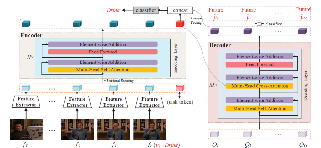 Decoder에서 예측한 미래 representation을 average-pooling한 \tilde{Q}와 task-related feature인 task token을 concat하고 FC layer, softmax를 거쳐 최종 class score를 얻는 것을 볼 수 있습니다.
