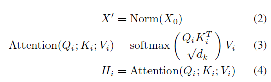 이후에도 마찬가지로 일반적인 Transformer encoder와 동일하게 동작합니다. X_{0}를 normalize하여 얻은 X'을 각 FC layer에 태워 Q_{i}, K_{i}, V_{i}를 만들고 총 N_{head}번의 multi-head self-attention 연산을 거쳐 H_{1}, H_{2}, \cdots{}, H_{N_{head}}를 얻을 수 있습니다.
