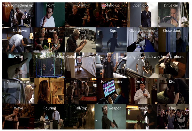 위 그림 4와 같이 그리 복합적이지 않은 action 총 30가지 클래스들로 이루어져 있습니다. 전체 데이터셋에서 하나의 클래스는 최소 50회 이상 등장하고, 일반적으로 드라마나 시트콤은 일상에 가까운 영상들을 포함하기 때문에 앞서 살펴본 HDD 데이터셋보다는 더욱 제한 없고 다양한 범위의 background를 가지고 있습니다.