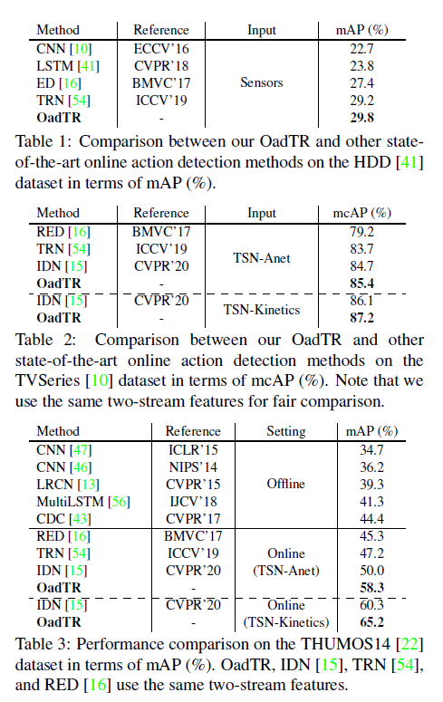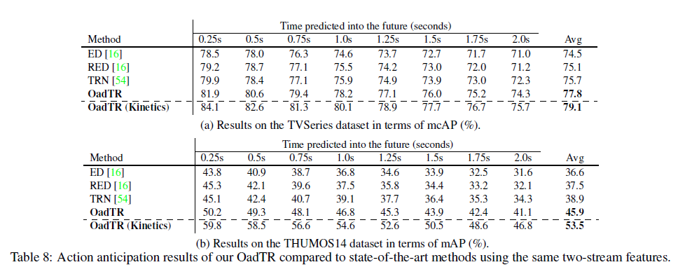 - We specially design the encoder and decoder of OadTR which can aggregate long-range historical information and future anticipations to improve online action detection