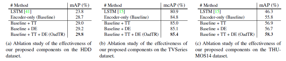 본 논문에서는 OadTR의 성능을 평가하기 위해 HDD, TVSeries, THUMOS14 데이터셋에 대한 벤치마크를 진행하였습니다. Ablation도 일부는 세 가지 데이터셋 모두에 대해서 성능을 보여주며 다양하고 풍부한 실험 결과들을 분석하고 있습니다.