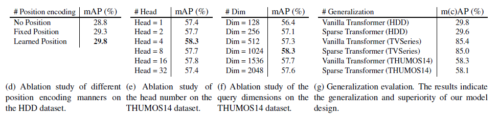 Positional encoding 종류, Multi-head의 개수, decoder query dimension(방법론 부분에서 설명드린 decoder에 들어가는 task token dimension), Transfomer 모델에 따른 성능이 각각 표 5- (d), (e), (f), (g)에 해당합니다. 표 (g)에서 저자의 방법론을 Sparse Transformer에 적용하는 경우 Vanilla Transformer에서보다 큰 성능 하락 없이 연산량을 낮출 수 있음을 보여주고 있습니다.