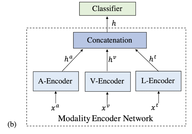 Modality Encoder Network는 raw feature를 기반한 modality 특정한 utterance level embedding을 추출합니다.