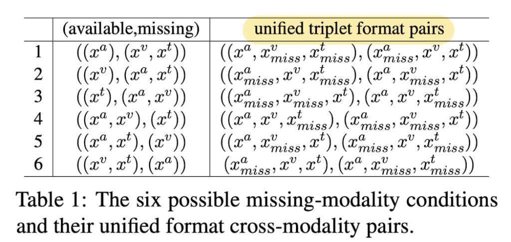 모든 모달리티 (x^a, x^v, x^t)가 training sample로 주어졌을 때 누락될 수 있는 상황은 6가지로 표현할 수 있습니다. 논문의 저자는 이를 cross-modality pair (available, missing)으로 표현하였습니다. 위의 표를 통해서 확인할 수 있습니다. available은 available modality를 의미하고, missing은 누락된 modality를 의미합니다.