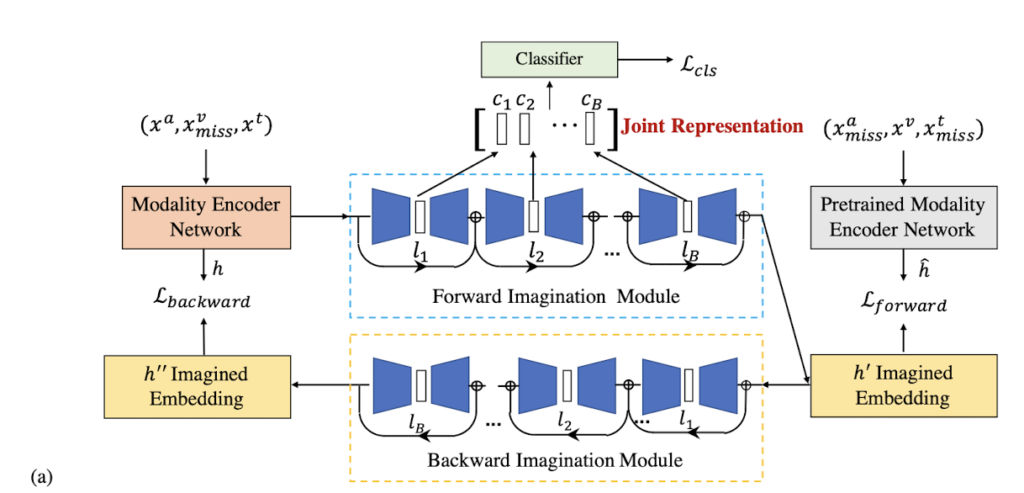 리뷰를 읽고 의문점이 있는데 연구원님께서 본문에 ‘missing-modality training conditions에서는 입력으로 unified triplet format에서 available modality와 missing modality를 참조하는 cross-modality pair가 포함됩니다.’라고 언급하셨는데, 모델에 cross-modality pair가 입력으로 들어가게 되면 결국 특정 모달리티가 누락된 h와 missing된 부분을 보완하는 h^을 동시에 사용하는 것과 같아지지 않나요? 그럼 결국 missing이 아니라 a, v, t 세 모달리티의 정보가 다 들어가는 것으로 보이는데 forward module과 backward module의 동작 과정을 설명해 주실 수 있으실까요?