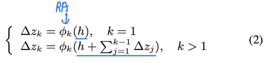 여기서 h는 추출된 multimodal embedding을 의미합니다. 그리고 \Delta{z_k}k번째 RA의 output을 의미합니다.