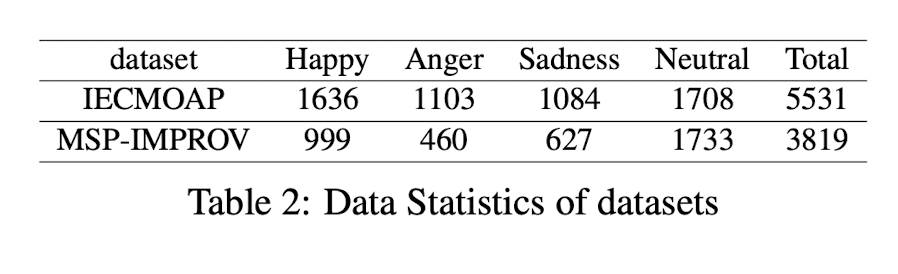 이 논문에 사용한 데이터셋은 IEMOCAP, MSP-IMPROV 입니다. 각 데이터셋의 감정 분포는 Table 2에 확인할 수 있습니다.