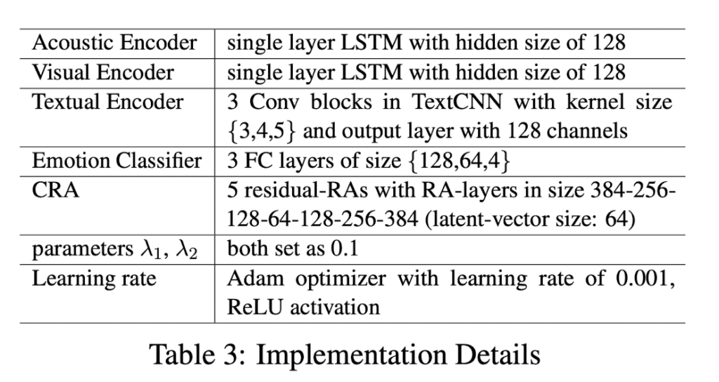 1번 Modality Encoder Network는 modality-specific embedding을 추출합니다. 2번 Imagination Module은 Cascade Residual Autoencoder (CRA)와 Cycle Consistency Learning을 기반으로 합니다. 이를 통해서 available 해당 modality의 representation이 주어지면 missing modality의 representation을 imagining 합니다. 3번 emotion classifier는 joint multimodal representation을 기반으로 emotion category를 예측합니다.