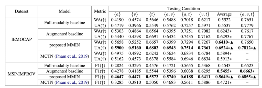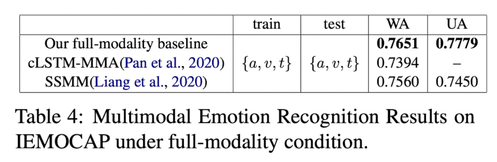 또한, Imagination Module을 통해 누락된 모달리티의 embedding을 예측한다고 하셨는데, 누락된 모달리티를 예측하여 감정을 예측하는 것을 제안하였다면 누락된 모달리티는 제외하고 나머지 모달리티의 feature를 이용하여 감정을 예측하는 경우와 비교한 실험이 있을 것 같은데, 혹시 어떤 실험 결과가 이에 해당하는 지 설명해주실 수 있나요??