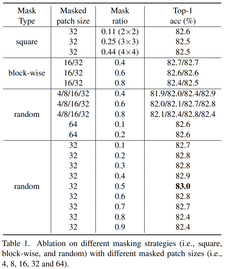본 논문에서는 ViT 뿐만 아니라 Swin Transformer 백본도 실험을 하고 있기 때문에 ViT의 경우에는 Default masked patch size를 32×32, Swin Transformer의 경우에는 4×4~32×32까지 다양하게 실험을 진행하였다고 합니다.