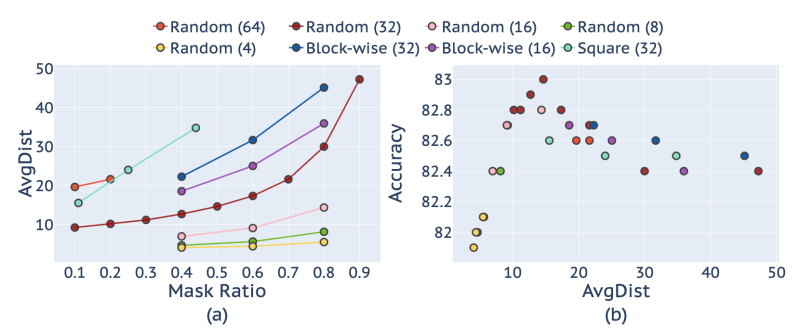 이러한 관점에서 저자는 표1의 관측치를 위에 그림3과 같이 AVGDist와 Mask Ratio(& patch size) 사이에 관계 그리고 Accuracy와 AvgDist 사이에 관계를 그래프로 나타내었습니다.