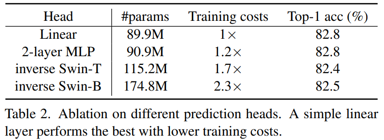 실험 종류로는 Linear Head(1 layer), 2-layer MLP, inverse Swin-T, inverse Swin-B 로 구성되어있으며, 점점 더 복잡한 구조로 가다보니 실제 학습에 필요한 파라미터 역시 89.9~174.8로 점차 커지는 모습입니다.