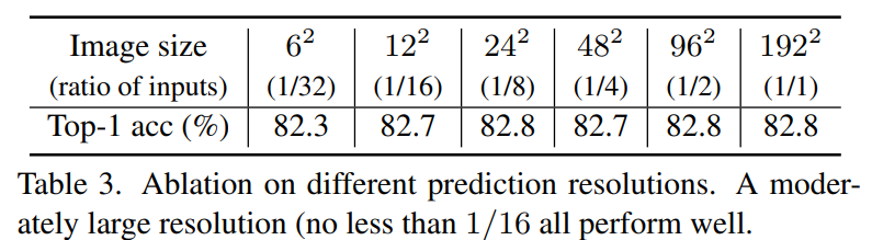 본 논문에서는 Ablation study 실험에 Swin-B backbone을 default backbone으로 활용하였으며, 앞에 내용에서도 확인하셨따시피 본 논문은 상당히 많은 양의 실험을 ImageNet-1K에서 진행하기 때문에 실험에 들어가는 시간을 줄이고자 입력 이미지 해상도를 224×224가 아닌 192×192로 활용하였다고 합니다.
