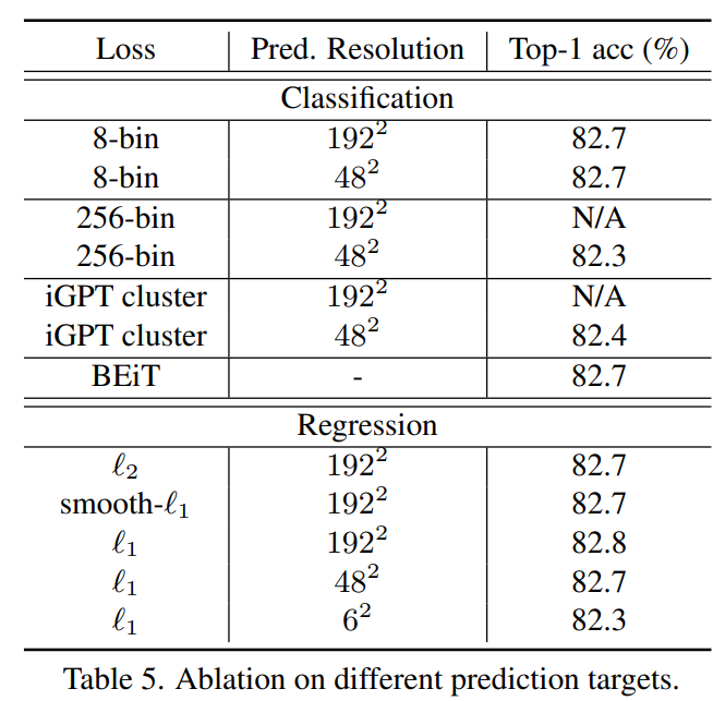Loss 컬럼에서 8-bin, 256-bin은 Channel-Wise bin color discretization을 나타낸 것이며, cluster와 BEiT는 각각 K-means cluster, Vision Tokenizor 끼리의 비교를 의미합니다. 그외에 L2, smooth l1, l1 loss도 있구요.