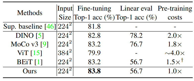 먼저 표6을 살펴보시면 본인들이 제안하는 방법은 그 당시 SOTA였던 BEiT와 비교하였을 때 0.6% 더 좋은 정확도를 보이면서 동시에 사전 학습에 들어가는 코스트 역시 가장 적은 값을 지닌다고 설명합니다.