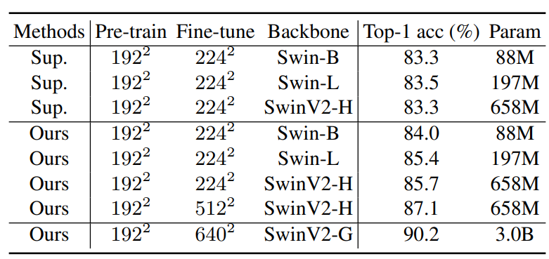 보다 구체적으로 Swin Transformer의 크기가 더 커지면 커질수록, 그리고 입력 해상도가 커지면 커질수록 더 좋은 성능을 보여주고 있으며 Supervised 방법론과 비교해서도 큰 성능 차이를 보여주고 있습니다.