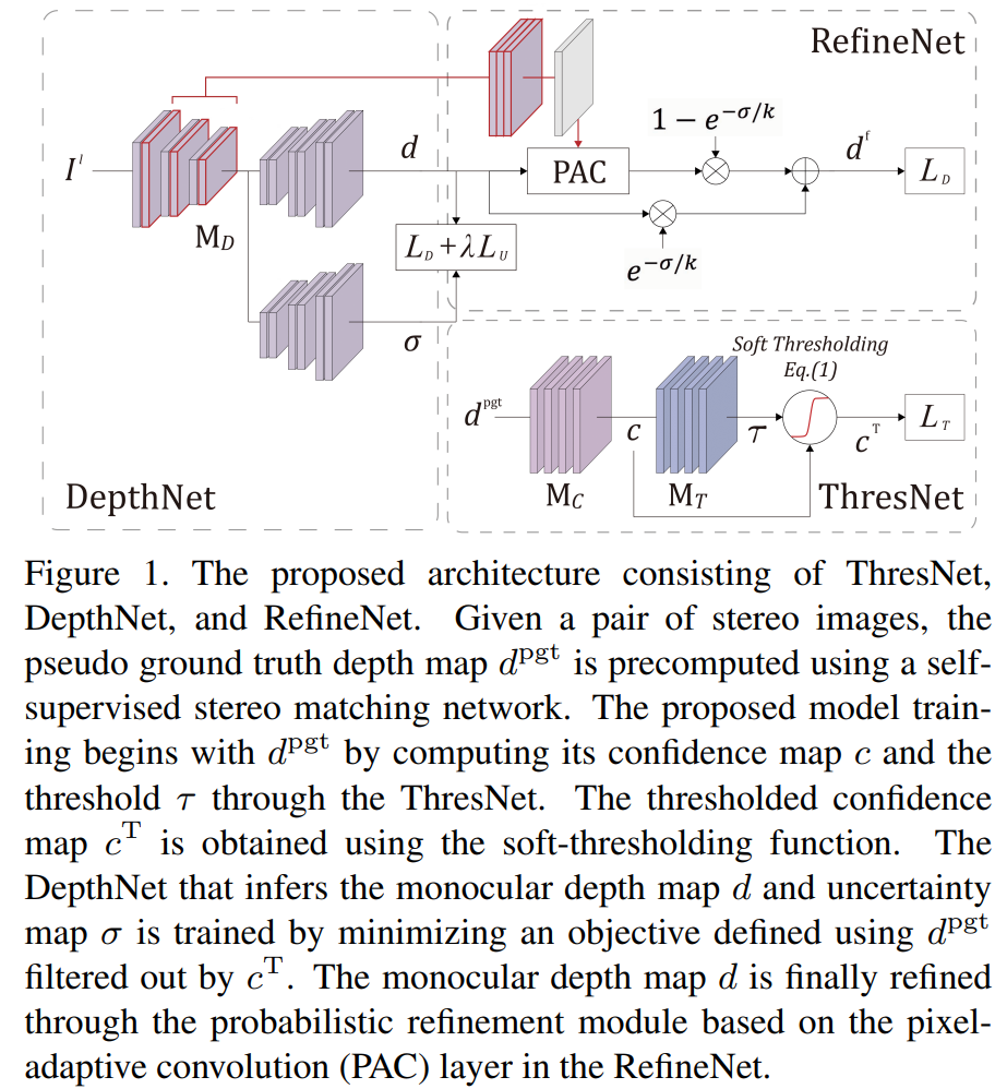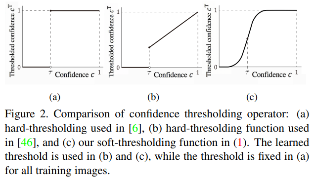 이러한 제한점을 극복하고자 저자는 (c) 와 같은, soft-thresholding 방식을 제안하게 됩니다. 제가 본 논문을 읽은 목적이기도 하지요. stereo depth 모델이 예측한 값을 pseudo label삼아 mono depth 모델로 전달하는 과정에서, 해당 pseudo depth map을 가지고 confidence map을 예측하게 됩니다. 그리고 confidence map은 저자가 제안하는 soft-thresholding function에 의해 학습된 threshold 값으로 걸러지게 됩니다. 그리고 이렇게 구해진 thresholded confidence map과 pseudo depth labels을 사용해서 최종적으로 mono depth 모델을 학습하게 되는 방식입니다.
