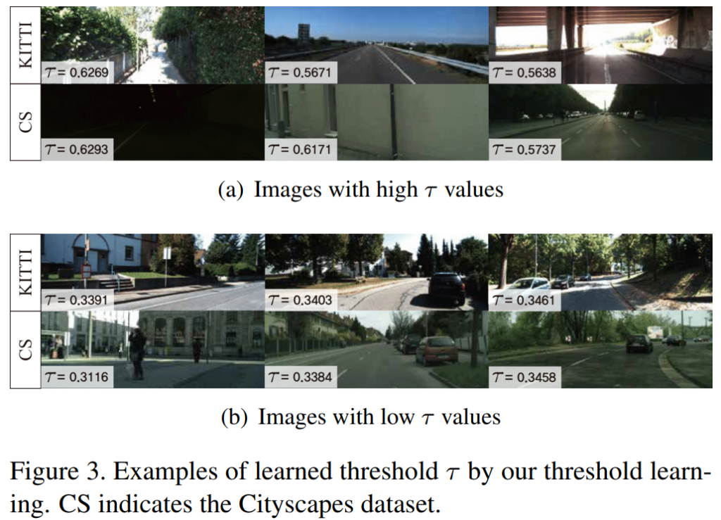 (a)에서 하늘, 도로, 벽 등의 textureless 하고 넓은 featureless 영역에 대해선 threshold 값이 높게 예측된 것을 볼 수 있습니다. pseudo label은 stereo 모델을 통해서 예측이 되고, 이러한 모델들은 left-right stereo matching을 원리로 disparity와 depth를 계산하게 되는데, textureless한 영역들에선 left-right의 매칭을 잘 수행할 수 없기 때문이죠. 쉽게 직관적으로 생각하실 수 있을것이라 생각됩니다.