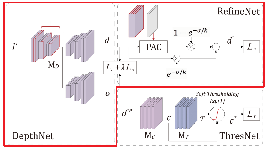ThresNet은 부정확한 pseudo depth label의 confidence map을 예측하고, soft-thresholding function을 통해 thresholded confidence map을 생성하는 network 입니다.