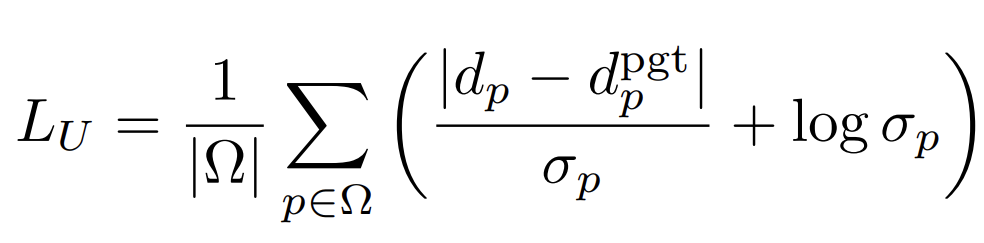 |d-d^{pgt}|를 uncertainty map \sigma로 나눠줌으로써 최종 mono 모델에서 예측한 depth map의 부정확성을 줄임과 동시에 뒷단에 log \sigma_p를 둠으로써 \sigma가 무한대로 발산하는것을 방지하였습니다. 앞쪽 loss term만 있으면 \sigma가 무한대로 발산했을때 loss가 0으로 수렴할테니 말이죠.
