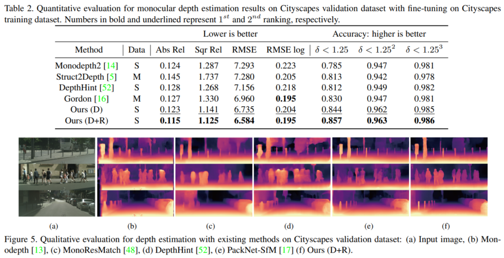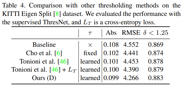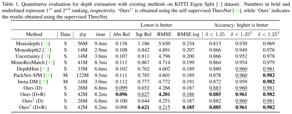 그리고 Ours에서 D는 ThresNet+DepthNet만을 사용한 것이고, D+R은 ThresNet+DepthNet에다가 RefineNet까지 모두 사용한 결과입니다. 그리고 마지막으로 제일 아래 2개 row에 \dagger 문양은 ThresNet을 self-supervised가 아닌 supervised로 학습했다는 의미입니다. 3.3.1절에서 언급드렸다시피 sparse한 LIDAR depth map를 함께 사용한 것이 supervised 입니다.