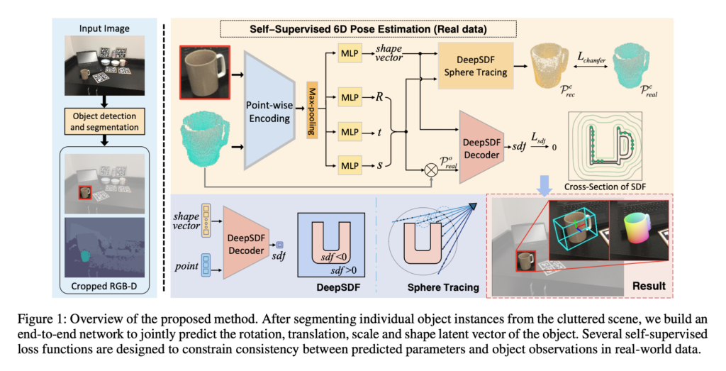 각 객체에 대한 명시적인 3D 모델 없이도 클래스에 속하지 않는 객체의 포즈를 추정할 수 있는 자기지도 방식을 구현하기 위해 먼저 합성 데이터에 대해 DeepSDF 디코더를 학습시켜 클래스에 대한 공통 특성을 미리 학습시킨 후, 형상 재구성을 위한 포즈 파라미터와 shape latent vector를 추정하는 자기지도 프레임워크를 구축합니다. 자기 지도 학습에서 초기 네트워크 출력(포즈 및 shape latent vector)이 주어지면 먼저 DeepSDF 디코더에서 물체의 모양을 재구성한 다음, 재구성된 모양과 예측된 회전, 이동 및 스케일 계수를 사용하여 3D 공간에서 지상 실측 포인트 클라우드 간에 최적의 정렬을 적용하기 위해 DeepSDF를 기반으로 몇 가지 새로운 손실 함수를 설계합니다. 형상의 불일치는 포즈 매개변수와 형상 잠재 벡터에 역전파되는 오류 기울기를 생성하여 포즈와 형상을 모두 최적화할 수 있도록 합니다.