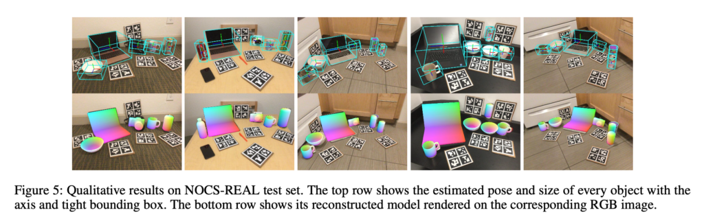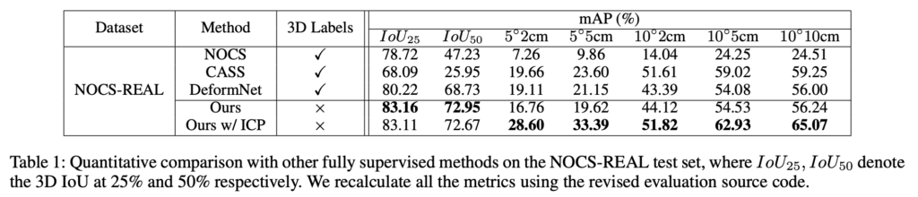 병, 그릇, 캔, 카메라, 노트북, 머그잔 등 6개의 물체 카테고리가 포함된 NOCS 데이터 셋을 대상으로 실험을 진행했습니다. 이 데이터 셋은 1085개의 CAD로 렌더링된 275K 렌더링 이미지가 포함된 합성 데이터 세트인 CAMERA와 훈련용 7개 장면의 4.3K 실제 이미지와 테스트용 6개 장면의 2.75K로 구성된 REAL이라는 실제 데이터 세트의 두 부분으로 구성되어 있습니다. REAL 데이터 세트의 각 세트에는 카테고리당 3개의 보지 못한 인스턴스가 있습니다. 먼저 합성 데이터 셋인 CAMERA를 통해 shape에 대한 사전 정보를 학습하기 위해 사전 학습을 진행하고 REAL 데이터 세트에 자체 감독을 적용합니다.