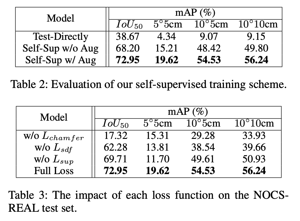 Tab 3에서는 loss에 따른 성능 차이를 볼 수 있습니다. chamfer loss가 없는 경우에 성능 저하가 크게 일어나는 결과를 볼 수 있습니다. 이는 해당 loss가 대략적인 물체의 위치, 회전, 스케일에 대한 정보에 대한 정보를 예측하는 역할을 하기 때문입니다. 또한 SDF loss는 chamfer loss를 기반으로 대략적인 조정을 수행하는 역할을 합니다.