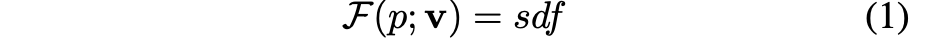 SDF는 부호화된 거리 함수를 의미하며, 한 점의 SDF 값은 서페이스 경계까지의 거리를 나타내고 부호는 해당 영역이 도형의 안쪽(-) 또는 바깥쪽(+)에 있는지 여부를 나타냅니다. 도형의 경계는 제로 레벨 세트로 인코딩됩니다. DeepSDF는 심층신경망을 사용하여 식 1과 같이 query point p /in R^3와 shape latent vector v /in R^k 로부터 연속 SDF value sdf /in R 을 회귀합니다: