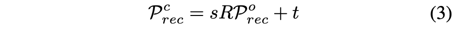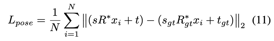여기서 x_i 는 3차원 모델에서 무작위 샘플링된 N개의 점 중 i번째 점에 해당합니다. R_{gt}, t_{gt}, s_{gt} 는 각각 회전, 이동, 스케일에 대한 GT 값에 해당합니다.