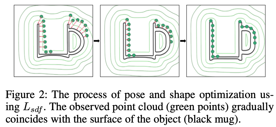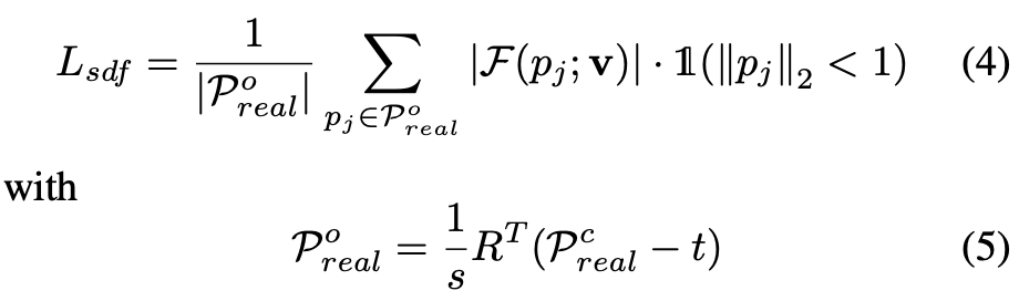 위 수식에서 1(·)은 대상 좌표계에서 단우 구 내부의 점만 고려하기 위한 indicator function으로, 편차가 큰 6D 포즈와 포인트 클라우드의 이상 값이 모양 조정에 미치는 영향을 피하기 위한 장치입니다. 또한, SDF 값이 0과 차이가 나면 DeepSDF 디코더를 통해 포즈 파라미터와 shape latent vecotr로 역파되는 기울기가 생성되어져 이에 대한 최적화를 수행할 수 있게 됩니다.