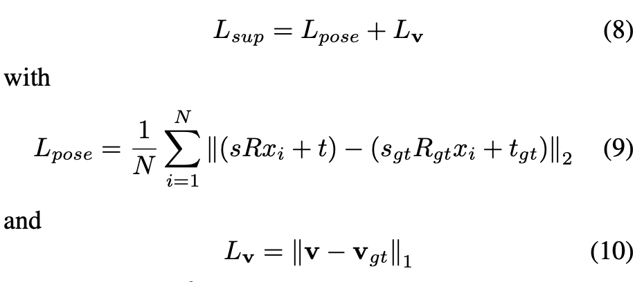 Pre-training and Joint Learning. 자가 지도 프레임워크의 학습을 위해서는 포즈와 모양 추정을 위해 초기화가 매우 중요하다고 합니다. 해당 논문에서는 먼저 합성 데이터 세트에 대해 지도 방식으로 모델을 사전 훈련하여 좋은 초기화를 제공하고 대상의 포즈와 모양의 대략적인 분포에 대한 사전 정보를 학습할 수 있도록 합니다. 합성 데이터 세트에 대한 fully supervised loss는 다음과 같이 정의됩니다