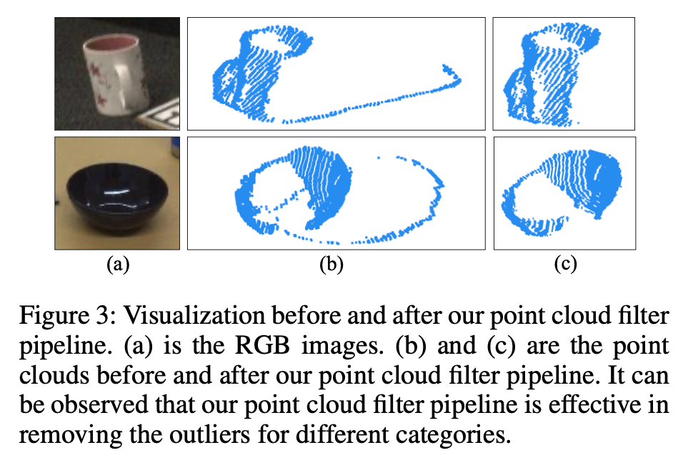 Point Cloud Filtering. 해당 태스크에서는 주로 수집된 포인트 클라우드를 사용하여 학습합니다. 그러나 부정확한 분할 마스크와 깊이 센서와 RGB 카메라 사이의 변위로 인해 분할된 전경 포인트 클라우드에는 종종 일부 배경 포인트가 포함되어 있어 모델 학습에 있어서 편차를 보일 수 있습니다. 따라서 이러한 이상값을 제거하기 위해 포인트 클라우드 필터 파이프라인을 제시합니다. 아랴의 fig 3에서 볼 수 있듯이 이상값은 주로 책상 표면에서 수집된 점들로, 먼저 RANSAC 알고리즘을 사용하여 책상 표면의 점을 제거한 다음 statistical outlier remval 알고리즘으로 이웃과 멀리 떨어져 있는 희소 이상값을 제거합니다. 마지막으로, 카메라에 가장 가까운 클러스터가 최종 포인트 클라우드로 선택되는 DBSCAN 알고리즘(Es-ter et al. 1996)을 사용하여 나머지 포인트들을 클러스터링합니다.