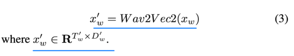 다음으로는 raw audio segment입니다. raw audio segment는 바로 wav2vec2 processor와 wav2vec2 model로 보내집니다. 그렇게 해서 raw wav2vec2 output x_w\prime을 얻게 됩니다. 수식으로 표현하면 [식 (3)]과 같습니다.