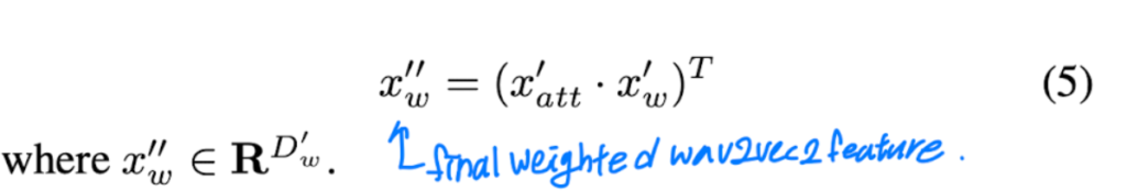 최종 weighted wav2vec feature를 얻기 위해서 이전에 생성된 가중치를 wav2vec2 output과 곱합니다. 수식으로 확인하면 [식 (5)]와 같습니다.