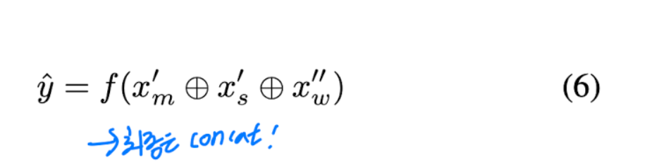 그래서 최종적으로 MFCC, spectrogram features, weighted W2E는 concat되어 음성 감정 예측값은 아래와 같이 표현됩니다.([식(6)])