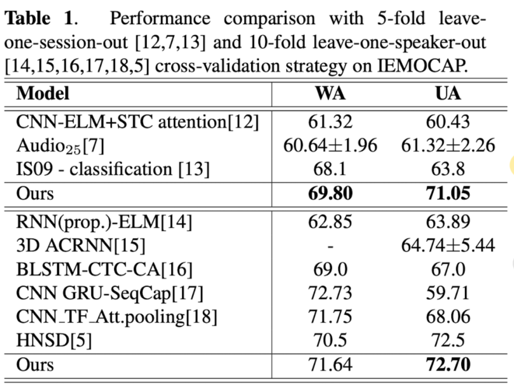 더 정확하게 평가하기 위해서 5-fold leave-one-session-out 그리고 10-fold leave-one-speaker-out cross-validation 전략을 사용했다고 합니다. 이를 통해 화자 독립적인 결과를 생성해냅니다. 그리고 보통 사용되는 weighted accuracy (WA), unweighted accuracy (UA)를 평가 metrics로 사용하였습니다.
