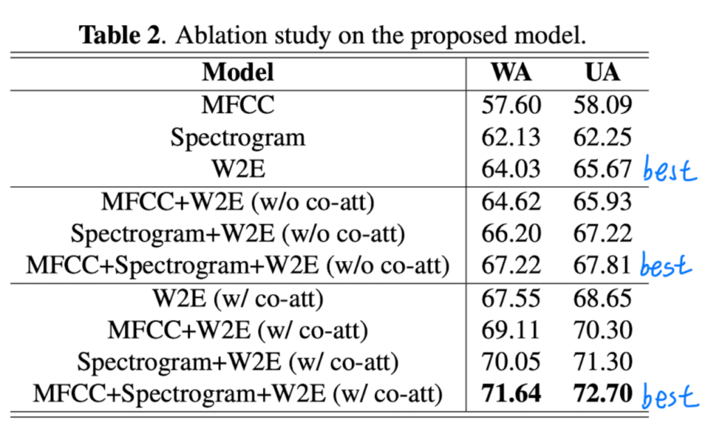 Table 2를 통해서 각자의 조합이 어느만큼 성능을 내는지 확인할 수 있습니다. 첫 3줄까지는 acoustic information의 하나 level만 사용했을 때 성능을 확인할 수 있는데, W2E가 가장 높은 성능을 내는 것을 확인할 수 있습니다. 2번째 칸은 다른 features와 W2E끼리 조합했을 때의 성능을 확인할 수 있습니다. 세번째 칸은 co-attention 후에 weighted W2E information과 다른 feature간 조합해을 때의 성능을 확인할 수 있습니다. 전체 모델의 성능에서 co-attention을 사용하여 모든 feature를 사용했을 때 성능이 가장 좋은 것을 확인할 수 있습니다.
