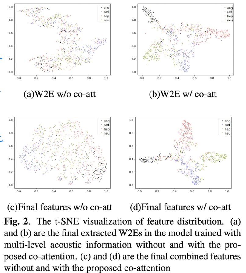 Fig 2에서 볼 수 있듯이, weighted W2E와 co-attention 후에 최종 combined된 feaure의 t-sne 시각화가 unweighted W2E와 co-attention 없이 최종 combined된 feature보다 훨씬 더 정확한 것을 확인할 수 있습니다.