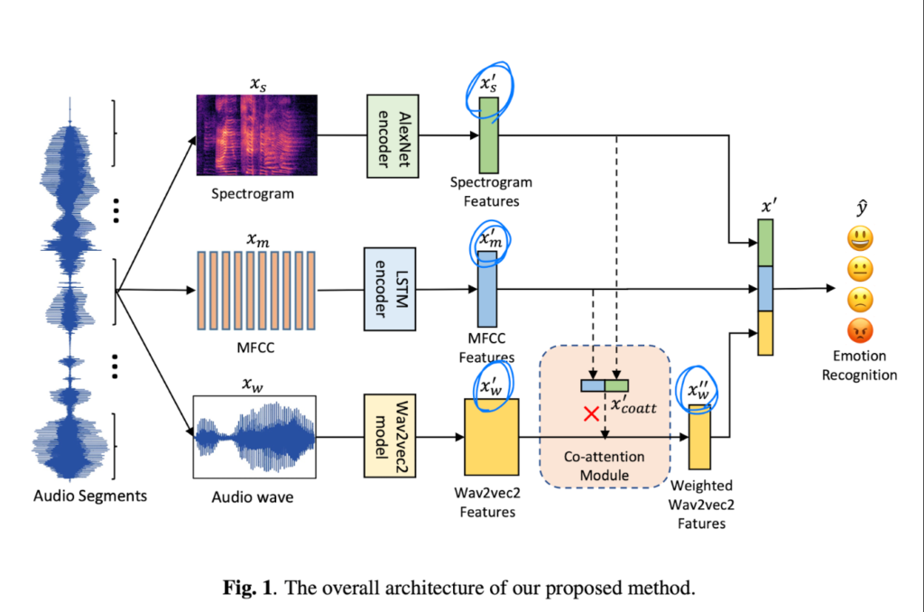 Fig 1을 보면 전체적인 구조를 파악할 수 있는데요. 그림을 보면 raw audio utterance를 몇개의 segment로 나눈 뒤에 segment에 3개의 level acoustic information (MFCC, spectrogram, W2E)를 각각의 feature encoder network에 넣은 뒤 co-attention으로 fusion하여 최종적으로 감정인식을 수행합니다.