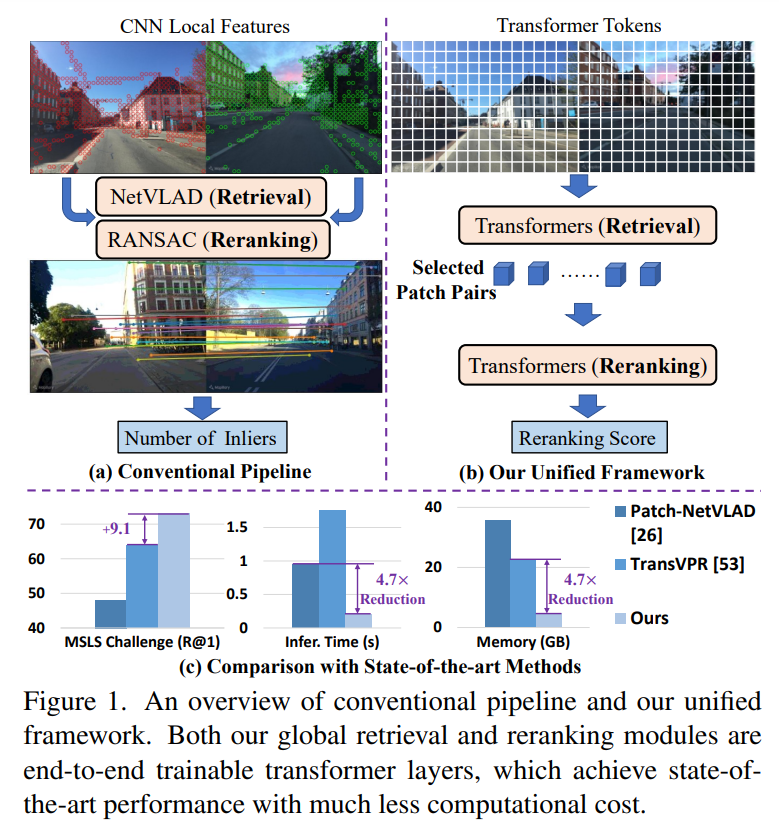 1. Retrieval과 Reranking 과정을 통합한 하나의 위치인식 프레임워크로, vision transformer 토큰을 통해 CNN feature와 유사하거나 더 좋은 Reranking 혹은 local matching을 수행함