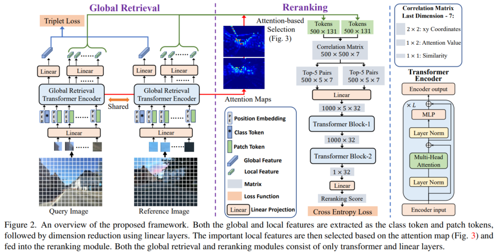 그림 2에서 확인하실 수 있듯이 쿼리와 레퍼런스 이미지는 동일한 Encoder를 공유하며, Global Retrieval을 위해 transformer만을 이용하여 feature와 추가적인 데이터를 추출합니다.