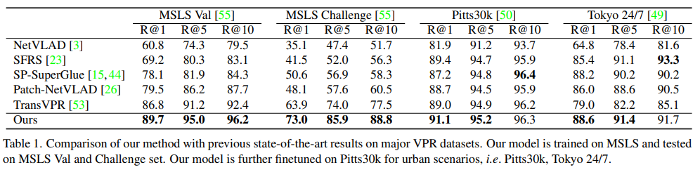 참고로 TransVPR도 end-to-end로 학습된 방법론입니다.(TransVPR 리뷰를 참고해주세요. ) 또한, 해당 논문에서는 TransVPR과의 차이점에 대해서 TransVPR은 feature extractor가 CNN으로 구성되지만, 저자들은 Transformer만을 이용하였다는 점을 제시하였습니다.