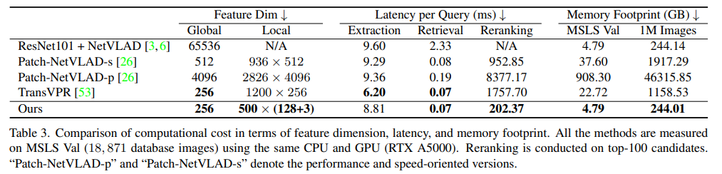 위의 표3은 연산량을 비교한 것으로, 기존의 방법론들과 비교했을 때, 차원수도 줄었고, inference time도 대체로 감소하였으며 메모리 사용량도 크게 감소하였다고 합니다.(메모리의 경우, NetVLAD는 reranking 과정이 없다는 점을 감안하여 표를 확인해주시기 바랍니다.)