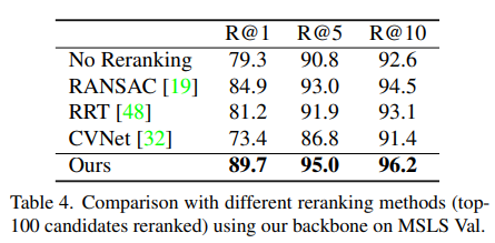 표4는 저자들의 방법론에서 Reranking을 다양하게 바꾸어 실험한 결과로, 기존 방법론들 중에서는 RANSAC이 가장 좋은 효과를 보였으며, 저자들이 제안한 방법론을 적용할 경우 상당한 성능 향상이 가능함을 실험적으로 증명하였습니다.