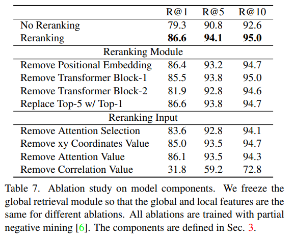 표7은 각 구성요소에 대한 ablation stuyd로 global retrieval 부분은 freeze하고, reranking 모듈 부분에 대해서 다야한 변화를 주어 실험을 진행한 것입니다.