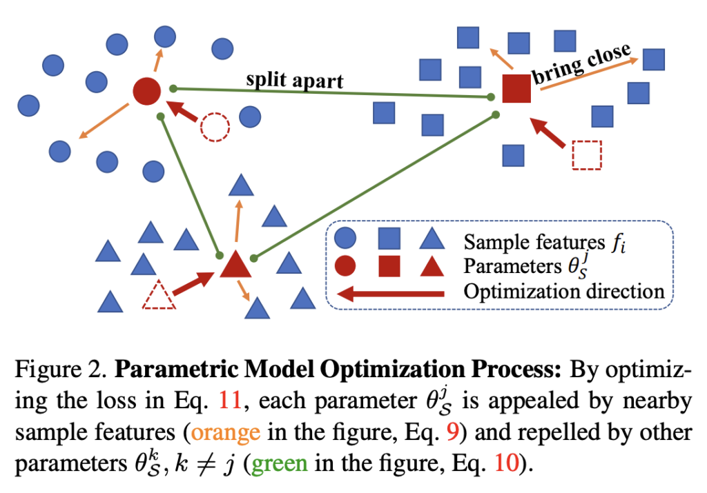 추출된 샘플 feature F^u_S와 정의한 파라미터 \theta_S의 차이점은 전자의 경우 데이터셋의 각 샘플에 해당하는 불연속적인 feature인 반면, 후자는 특징 공간에서 연속적이다 라는 점입니다.