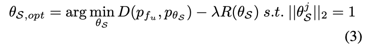 D는 분포 사이의 거리를 나타내는 메트릭이고, R은 데이터셋의 다양성을 측정하며 \gamma는 이 두 항의 균형을 맞추는 가중치입니다. 첫번째 항인 D(p_{f_u}, p_{f_S})가 저자의 직관 1)에 해당하고, R(F^u_S) 가 직관 2)에 해당합니다.