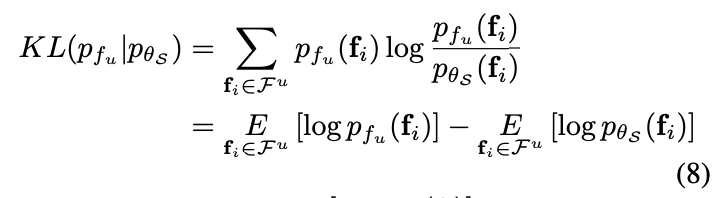 이제 두 분포 pfu , pθS는 KL-분산을 최소화 하는 과정을 통해 가까워지도록 업데이트를 할 수 있습니다. 이 과정이 다음 [수식 8] 과 같이 정의합니다.