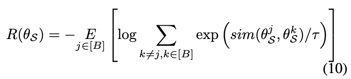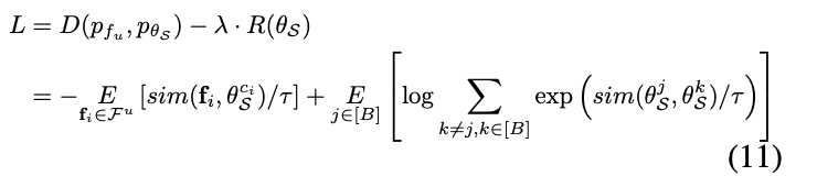 여기서 첫번째 항은 매개변수 \theta_S가 없는 상수입니다. 그러면 KL-분산을 최소화하는 것은 두번째항을 최대화하는 것과 같기 때문에 최종적으로 식 3의 첫번째 D 에 대한 항은 다음과 같이 도출 될 수 있습니다.